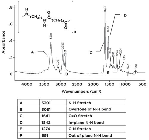 Figure 4: The infrared spectrum of the polymeric secondary amide Nylon-6,6 (repeat unit C12H22N2O2).