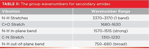 The C=O stretch of our secondary amide is seen in Figure 4 at 1641, in the 1680 to 1630 range typical of all amides. Note, however, it has a companion peak at 1542. This is the in-plane N-H bend of the secondary amide group, and is normally found from 1570 to 1515. This peak’s position is unusual in that there are very few group wavenumber peaks that fall around 1550, and it is unusually intense for an in-plane bend. We have said very little about in-plane bends throughout this column series, because they are generally weak and typically fall in the middle of the busy fingerprint region where they are easily lost. This in-plane bend is higher in wavenumber and more intense than others because of the conjugation that takes place in amides (5). The C=O and N-H in plane bend peaks form a diagnostic pair of sharp, intense peaks in the middle of the spectrum. Combine these with the single N-H stretch of secondary amides and you have a trio of peaks that clearly indicate when a secondary amide is present in a sample. For the nylon family of polymers particularly, this pair peaks falls at ~1640 and ~1540, and are easily spotted. The N-H wag of secondary amides forms a broadened envelope from 750 to 680 and is seen in Figure 4 at 691. The summary of secondary amide group wavenumbers is seen in Table II.