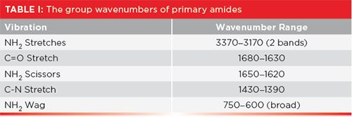 In a previous column (3), I pointed out that C-N stretches are not useful group wavenumbers, since they are usually medium-to-weak in intensity, and fall from 1400 to 1000, right in the middle of the very busy fingerprint region, where it is easy for them to get lost. The C-N stretch of benzamide is seen at 1398. This particular molecule has a relatively simple spectrum, so this peak is visible, but you can see how it might get lost if there were other peaks of similar size around it. A summary of the group wavenumbers for primary amides is seen in Table I.