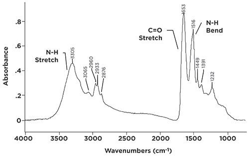 Mammal hair, skin, feathers, and reptile scales are all made from keratin, so it is a commonly found material. The spectrum in Figure 5 is of sheep hair (wool). Note that the spectrum is dominated by secondary amide peaks, with N-H stretch, C=O stretch, and N-H in-plane bend peaks clearly visible.