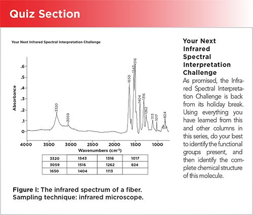 As promised, the Infrared Spectral Interpretation Challenge is back from its holiday break. Using everything you have learned from this and other columns in this series, do your best to identify the functional groups present, and then identify the complete chemical structure of this molecule.