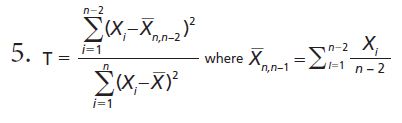 2. T = (Xn– Xn-1)/σ (7). This test is similar to test 1 except that the denominator contains the population standard deviation (which must therefore be known) instead of the sample range.