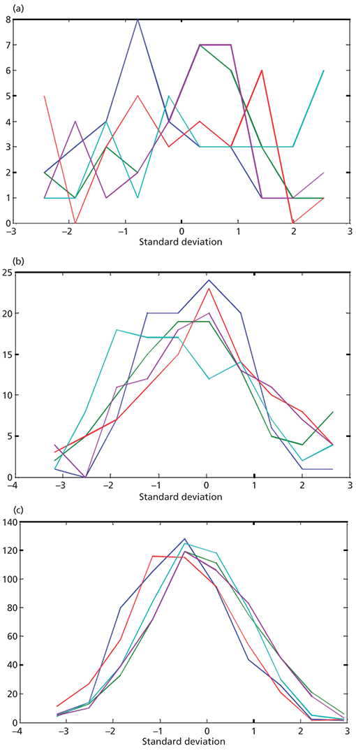 Figure 2: Actual distributions (histograms) of samples of various numbers of readings taken from the normal distribution, showing the actual distributions of values achieved, for each case. For each part of this figure the random sampling was repeated five times, to allow the variability of the data to be seen. The plots show distributions of (a) 30, (b) 100, and (c) 500 random readings.