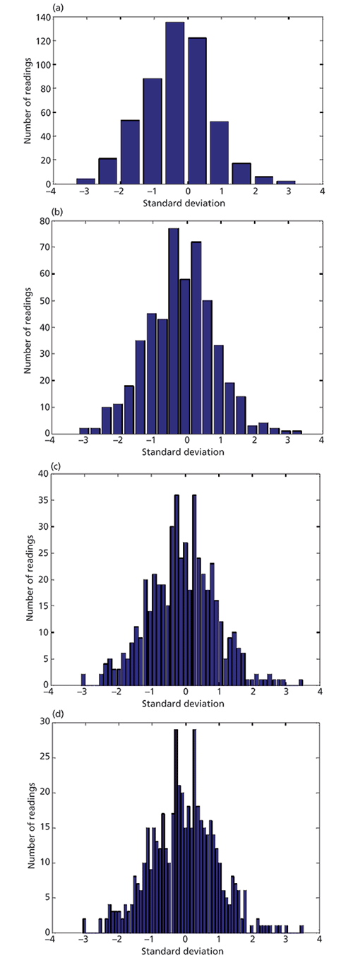 Figure 3: Histograms for 500 normally distributed numbers (representing errors in a calibration) in histograms using (a) 10, (b) 20, (c) 50, and (d) 70 bins. These histograms were all generated from the same set of random numbers.