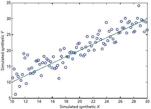 So, how does all this affect our methods of analyzing calibration plots? Figure 4 shows a simulated calibration plot using synthetic data representing 100 samples with characteristics similar to what are found in many calibration datasets. Both the x- and y-data were based on a uniform distribution of samples with a range going from 10 to 30; this is represented by the solid line. Random normally distributed numbers representing calibration errors with a standard deviation or 2 were then added to the y-data, and the individual data points were plotted as blue circles.