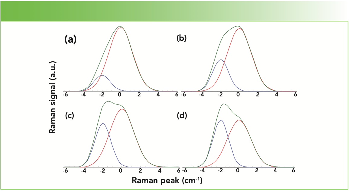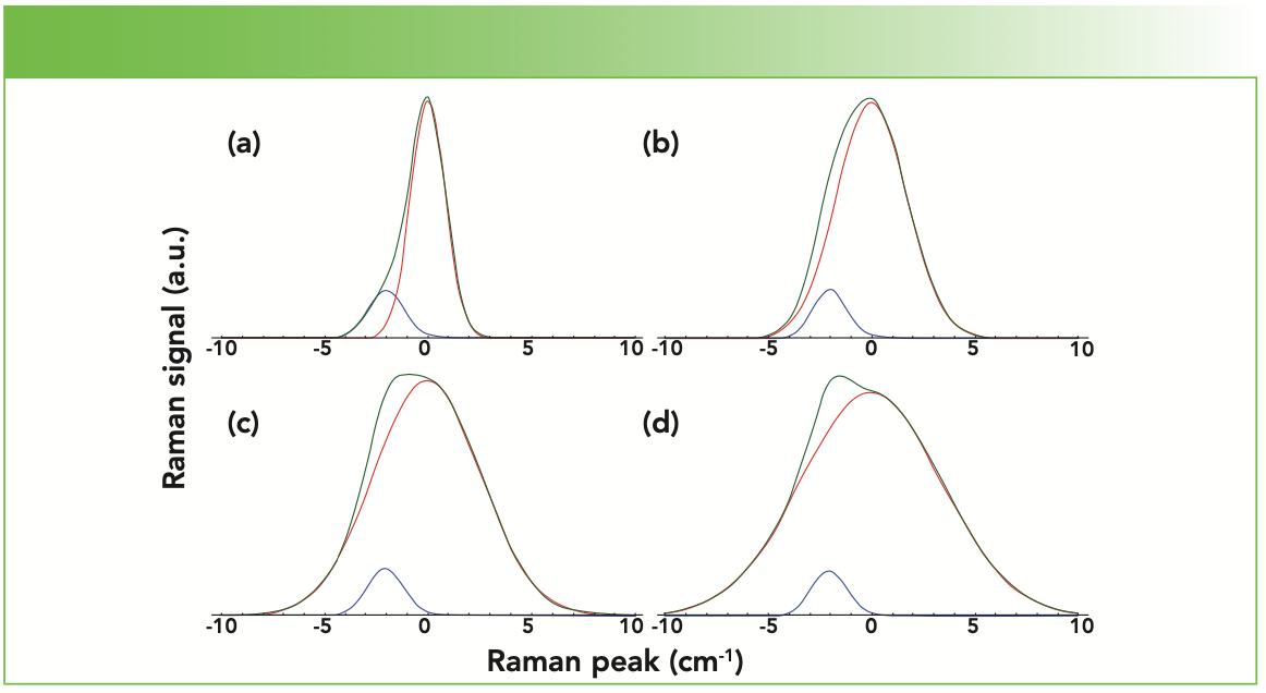 FIGURE 3: Convolution (green) of two closely spaced Gaussian peaks of different bandwidths with the side peak (fwhm = 2 cm-1) (blue) varying in signal strength: (a) 0.25, (b) 0.50, (c) 0.75, and (d) 1.0, relative to that of the central peak (fwhm = 3 cm-1) (red).