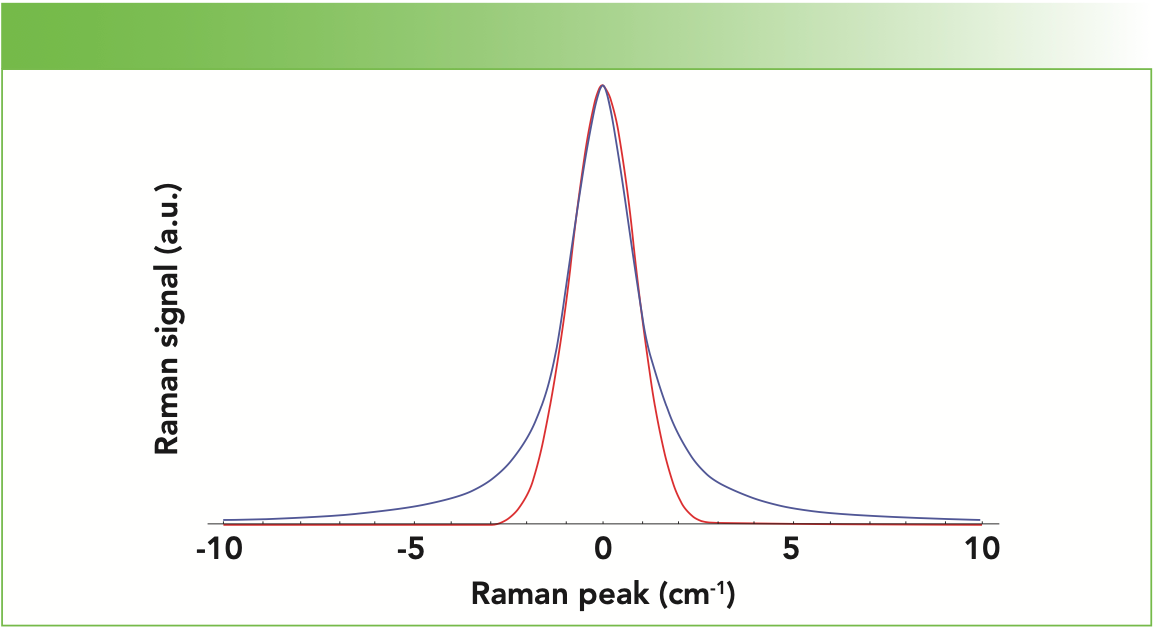 FIGURE 1: Gaussian (red) and Lorentzian (blue) Raman peak profiles in arbitrary units: fwhm = 2 cm-1.