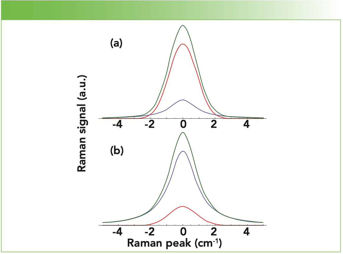 FIGURE 2: Different Gaussian (red) and Lorentzian (blue) contributions to a single composite (green) peak: fwhm = 2 cm-1: (a) 80% Gaussian and 20% Lorentzian, and (b) 20% Gaussian and 80% Lorentzian.