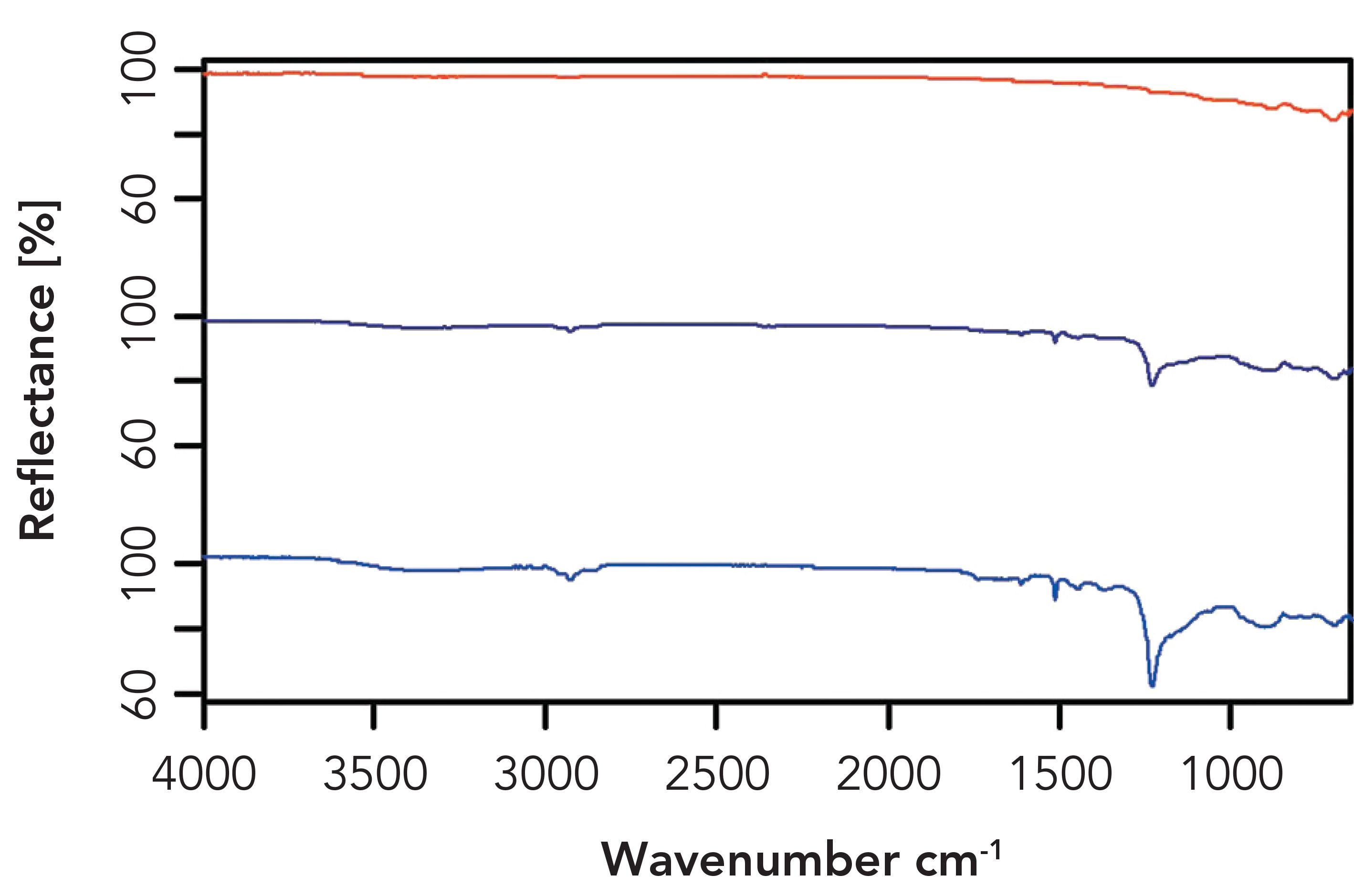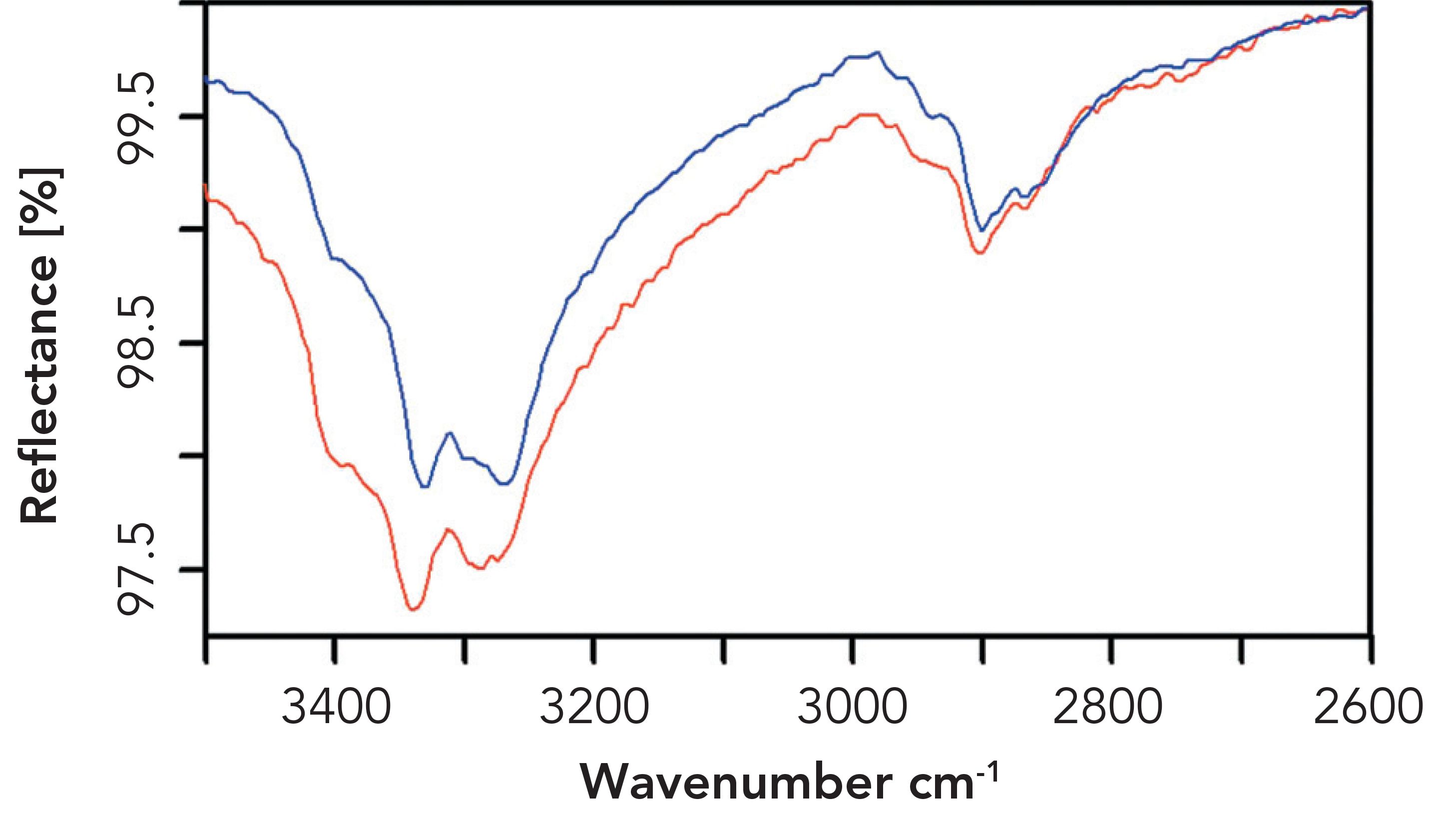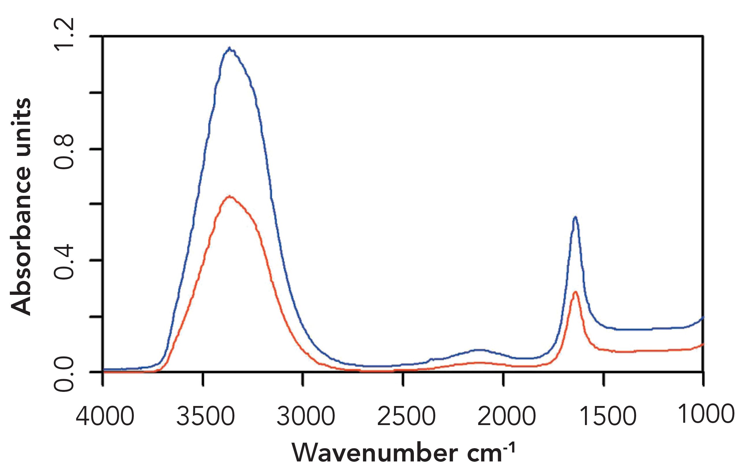 Figure 1: ATR spectra of water recorded with the polarizer set to 90 (red) and 0 (blue).