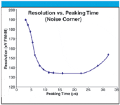 Since the PX4 has 24 programmable peaking times between 0.8 and 102 µs, it is well suited for a wide variety of applications. In addition, the determination of Resolution vs. Peaking Time (finding the noise corner), as in Figure 3, can be performed automatically by a software routine. With this information, the user can easily select the appropriate peaking time to maximize performance for the particular application, whether it be the best resolution, higher throughput, or a trade-off between the two.