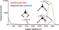 Recall that in the first part of this series we discussed the normal vibrational modes of water. We found that there were three Raman active modes, two stretching and one bending. Furthermore, we found that the bending mode (ν2) and one of the stretching modes (ν1) are totally symmetric (A1) and therefore polarized, whereas the antisymmetric stretch (ν3, B2) is depolarized. The polarized Raman spectra of water shown in Figure 1 includes the depictions of the normal vibrational modes that we presented in part I (1). Spectra are shown in the parallel and perpendicular polarized configurations and all three of the normal vibrational modes can be assigned based on their energies and polarization responses. There are several things to notice in these spectra. First, you see that the energy of the bending mode, which appears in the so-called fingerprint region of the vibrational spectrum, is substantially less than that of the stretching modes. Second, note how much more intense either the symmetric or antisymmetric stretching modes are relative to the angle bending mode. As a general rule, the symmetric stretches of bonds tend to yield stronger Raman bands.