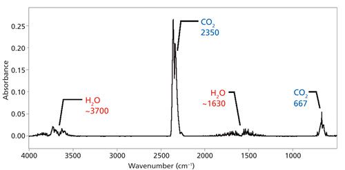 Water vapor and carbon dioxide are strongly IR-absorbing atmospheric gases whose ambient concentrations are high enough for their peaks to appear in mid-IR spectra. A spectrum of the atmosphere is shown in Figure 4.