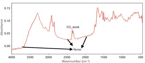 Spectral artifacts are peaks not caused by the sample. The most common types of spectral artifacts in IR spectra are water vapor and CO2 peaks; a CO2 peak is shown in Figure 1. These peaks can be minimized by running a fresh background, changing the desiccant in your instrument, or purging the instrument with dry nitrogen.