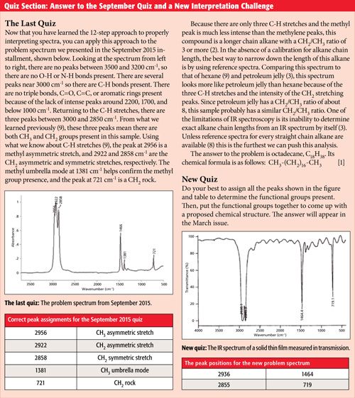 The problem with mixtures in IR spectroscopy is that the more complex the composition of a sample, the more difficult it becomes to figure out what peaks are from what functional groups. A large part of a previous column was devoted to how to get around the mixture analysis problem (2). Please consult that installment for guidance on this topic.