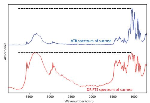 Figure 3: Bottom: The IR spectrum of sucrose measured by diffuse reflectance infrared Fourier transform spectroscopy (DRIFTS). Top: The IR spectrum of sucrose measured using a diamond ATR accessory. Note the difference in relative peak heights in the two spectra.