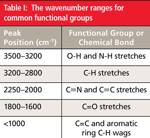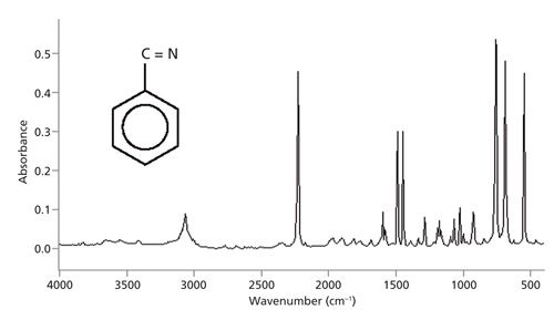 When plotted in this orientation you scan the spectrum from left to right and use the peak ranges in Table I to quickly determine whether certain important functional groups are present or absent from a sample. For example, there are no significant peaks between 3500 and 3200 cm-1 in Figure 5, which means the sample does not contain any O-H or N-H bonds. There is a medium size peak near 3000 cm-1, indicating there are C-H bonds in the sample. Triple bonds such as C≡N and C≡C have stretching peaks around 2200 cm-1. The strong peak in this region in Figure 5 is from a nitrile (C≡N) bond. There are no significant peaks between 1800 and 1600 cm-1, which means there are no carbonyl (C=O) bonds present. Lastly, there are several strong peaks below 1000 cm-1, indicative of unsaturated carbon (C=C or aromatic ring) C-H wagging vibrations. In this case, there is a benzene ring in the sample.