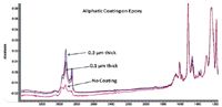 The spherical germanium ATR also provides highly surface selective analysis. The Exoscan has been used to measure a thin aliphatic coating on an epoxy surface. The aliphatic coating was applied as a processing aid; the thickness was less than 0.5 µm. The Exoscan was used to spot check the surface in order to find areas of unsatisfactory application and to determine if the aliphatic coating was applied evenly to the surface. Figure 4 shows spectra of the uncoated epoxy substrate, the substrate with a thin (0.1 µm) coating and the correct (0.3 µm) coating. The epoxy signature is strong in these samples; however, the surface selective nature of the germanium ATR allows quantitative analysis of the ultra thin surface coating.