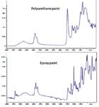 Figure 2: Examples of a polyurethane paint (top) and an epoxy paint (bottom) measured with the hand-held Exoscan using the spherical diamond ATR sample interface. The spectra, which were measured at 4 cm-1 resolution, took approximately 10 s to acquire.