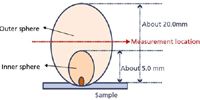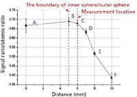 The Measurement Positioning of the Plasma Sphere: The LIP appeared with a very small flashing light in the air atmosphere. But, the fluctuation of signals was seriously increased by the white noise. So, we carried out a measurement at low pressure to minimize the white noise, and it almost never appeared at low pressure. The thinner the ambient gas becomes, the larger the size of the plasma sphere becomes. As a result of the study, the growth of the plasma started at a gas pressure of 15.0 Torr, and the plasma was slightly distinguishable by the inner sphere and the outer sphere at a pressure of 900 mTorr. It was clearly distinguishable at a pressure of 600 mTorr, and the sphere size was about 20.0 mm at this pressure. The boundary of the distinction between the inner sphere and the outer sphere was about a 5.0-mm distance in the direction of a plasma sphere from a sample's surface. Therefore, the measurement was made at a 6.0-mm distance in the direction of a plasma sphere from a sample, in the outer sphere region in the plasma. The signal intensity decreased rapidly after this 6.0-mm distance. Figure 3 shows the measurement location for the actual experiment, and Figure 4 shows a signal intensity variation (relative ratio) for the measurement location. Here, the relative ratio was calculated to assess the integrity of the measurement values; it was calculated as