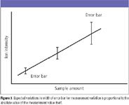 What is the practical consequence of this dependence? One consequence is that the regression analysis is best accomplished with a weighting method. The 1/y2 weighting minimizes the sum of the squared values for relative distances of experimental points from the best-fit curve. This weighting method is appropriate when, as shown in Figure 3, the expected errors are higher at higher measured values. In this instance, although the absolute size of the error bar at higher y values increases, the relative value ([range of errors in y]/y) is assumed to remain constant. Again, this is a mathematical assumption, and not necessarily the real observed or real physical model. In situations in which another function describes the distribution of error bar widths, a different weighting scheme might be appropriate (the 1/y weighting scheme is an example). The 1/y2 weighting is the most commonly found in nonlinear regression used in quantitative MS.