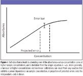 In a quantitative analysis using values measured with mass spectrometry (MS) — usually values associated with ion intensities — a nonlinear regression (weighted or nonweighted) might model the proportionality between measured instrument response and sample amount more accurately. We begin by considering general factors that might cause deviation from linearity at the upper and lower limits of a calibration curve. Recall that in quantitative spectrophotometry (in which a linear relationship is established by the equation A = εbc, where A is the measured absorbance, ε the molar extinction coefficient, b the path cell length, and c the sample concentration), the phenomenon of self-absorbance is presented as one of many reasons for a "deviation from Beer's law," resulting in a "turning over" of the measured absorbance curve at higher sample concentrations (Figure 1). In the simplest of terms, this phenomenon results when sample molecules no longer interact independently with the incident light beam. For some molecules in solution, the intensity of the incident light has been attenuated already by prior interaction with other sample molecules in the cell. Beer's law and its deviations is a popular undergraduate laboratory experiment, and for an intermittently tongue-in-cheek discussion of Beer's law as applied to the analysis of dark beers, see reference 1. Statistical and nonlinear methods have been developed over many years to extend the useful range of quantitation using Beer's law.