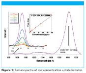 Solutions of sulfate with concentration below 100 ppm were prepared by dissolving sodium sulfate in distilled water. One ppm is defined as one milligram of SO4 in one liter of water. An Enwave ProRaman instrument with a wavelength-stabilized 785 nm laser, a high throughout TEC-controlled CCD spectrograph, and a fiber optics probe was used for the measurements. All solutions were kept in quartz cuvette during the measurements.