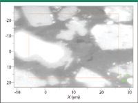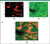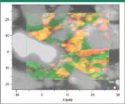 Figure 1 shows a Raman image of an iron alloy that had been corroded. The sample had been embedded in epoxy and cross-sectioned. Video images showed areas of varying shades of white and grey. The white areas tended to be nonoxidized metal, whereas the grey regions reflected spectra of a mixture of hematite (Fe2O3) and magnetite (Fe3O4). The Raman image was reconstructed from the hyperspectral cube produced by mapping the sample. Pure spectra were extracted from the cube and used to model the map.