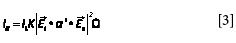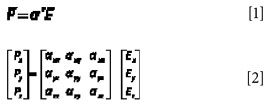 where α' is the Raman polarizability tensor representing the vibrational modulation of the polarizability, ε-bar is the incident electric field vector, and ρ-bar is the time-varying dipole moment (also a vector) induced by the interaction of the incident electric field with the vibrationally modulated polarizability of the material. The Raman polarizability tensor is fixed relative to the positions of the atoms and the directions of the bonds between them. Therefore, for a crystal fixed in space, the relationship described by equation 1 is dependent on the crystal symmetry and the orientation of the sample relative to the direction and polarization of the incident and collected light. This relationship constitutes that part of the expression for Raman scattering intensity of interest to us here, as follows: