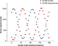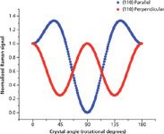 The Si(100) experimental P/O plot consists of two sinusoidal functions 45° out of phase and the plot form is in excellent agreement with the calculated diagram of Figure 1. However, note that calculations predict a maximum response at 0° for the perpendicular configuration, whereas the parallel configuration is near maximum at 0° for the experimentally obtained data. This can be understood in terms of the crystal orientation of the calculation compared to the sample angle with respect to a laboratory reference frame. The approximately 55° phase shift between the experimentally obtained and calculated Si(100) P/O plots is understood as a difference in the crystallographic starting orientations for data collection, and it illustrates an application of P/O micro-Raman spectroscopy for the analysis of texture in natural materials or fabricated devices. P/O plot phase shifts can be used to quantitate the degree of crystallographic orientation or alignment of different features on a micrometer scale relative to a package coordinate system for device fabrication.