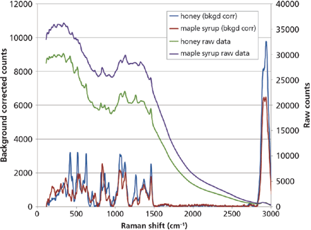 The Raman measurements discussed in this application note were made with a TSI | Chemlogix ProRaman-L instrument with 250 mW of 785 nm laser excitation and a spectral range of 100–3300 cm-1. The spectra were collected with a 3-s acquisition period and 20x averaging. The raw spectra, presented in Figure 1 (secondary y-axis), were then corrected for the native fluorescence in the material with the TSI standard background correction algorithm (results plotted on primary y-axis). Honey and Grade A maple syrup samples were presented to the system in a standard quartz cuvette held inside the vial-holder accessory.