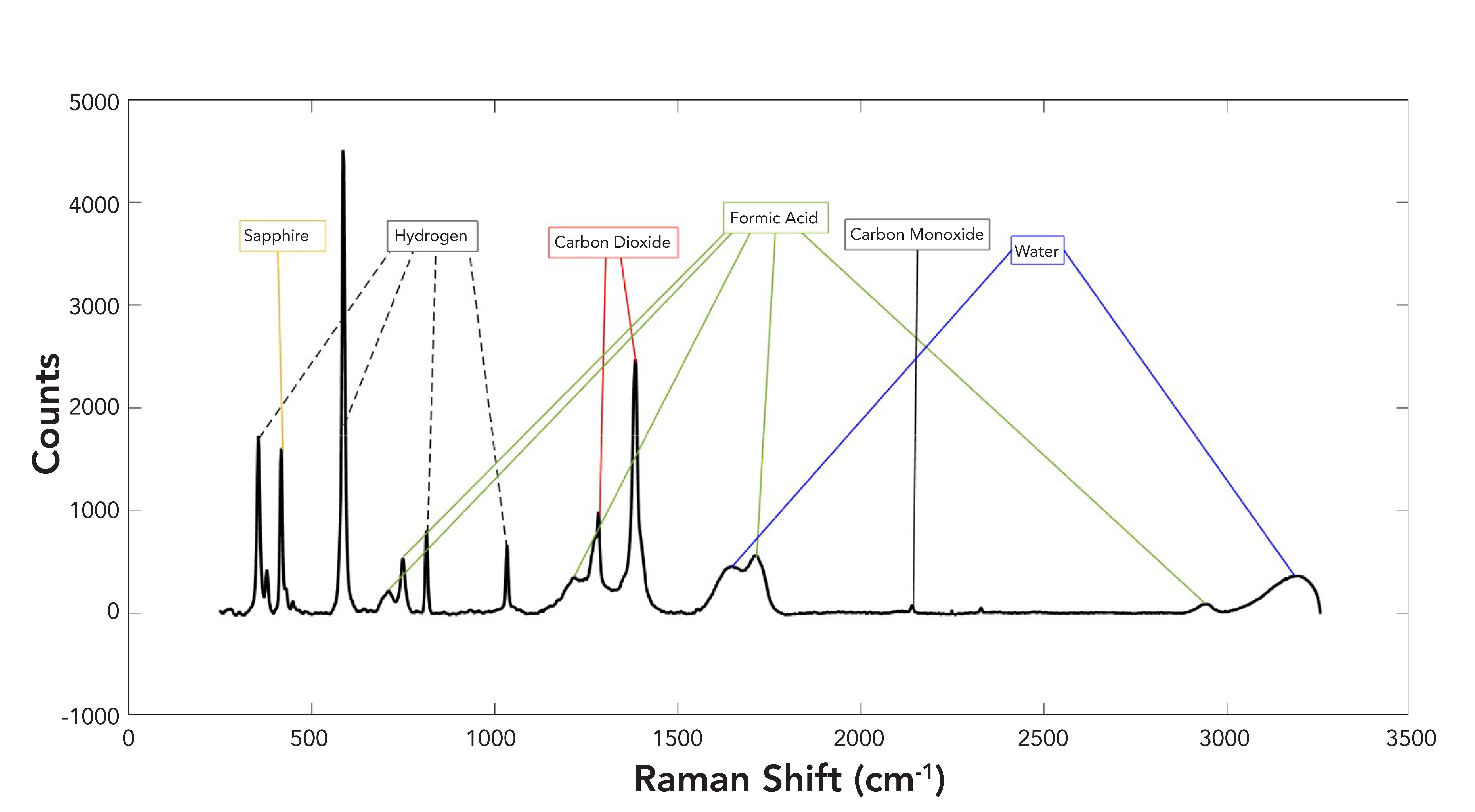 Figure 5: Raman spectrum of decomposition products of formic acid. Correlated chemical species identify Raman peaks of relevant components. (Courtesy of Igor V. Novosselov, University of Washington.)