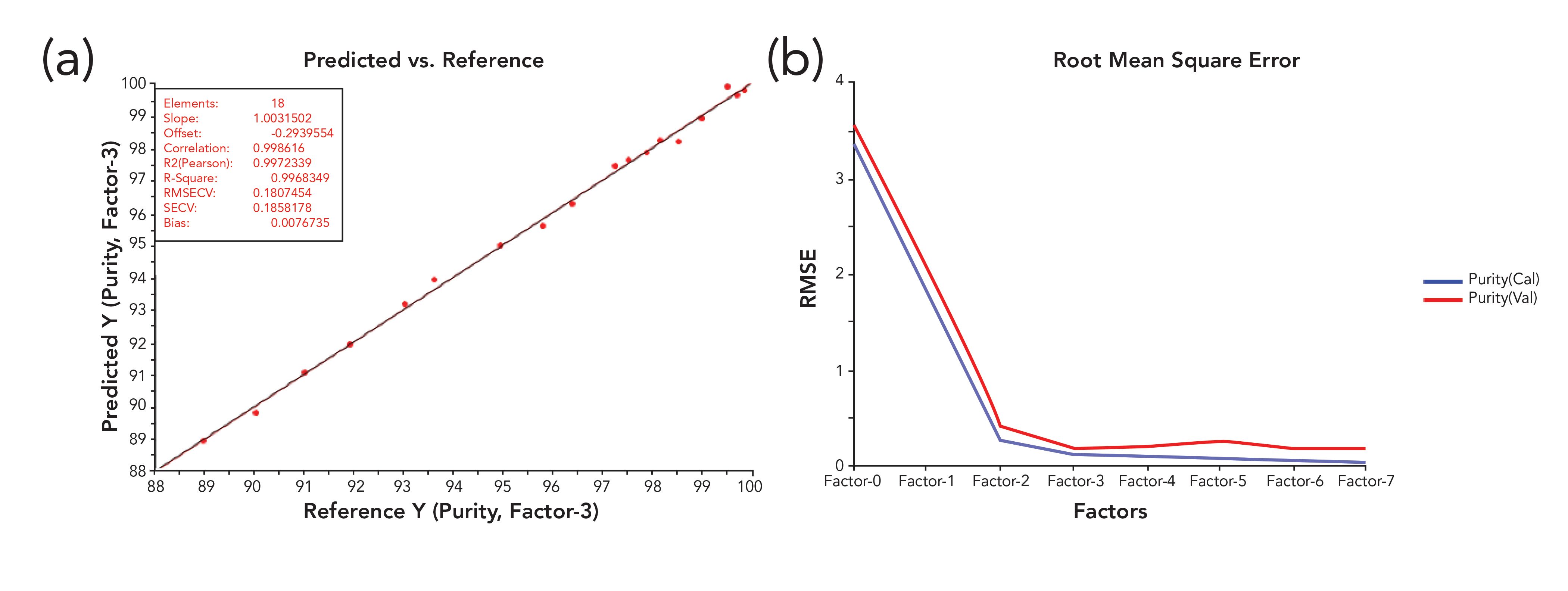 Figure 2: Statistical results for the cross-validation: (a) predicted vs. reference regression plot; (b) root mean square error vs. number of PLS factors.
