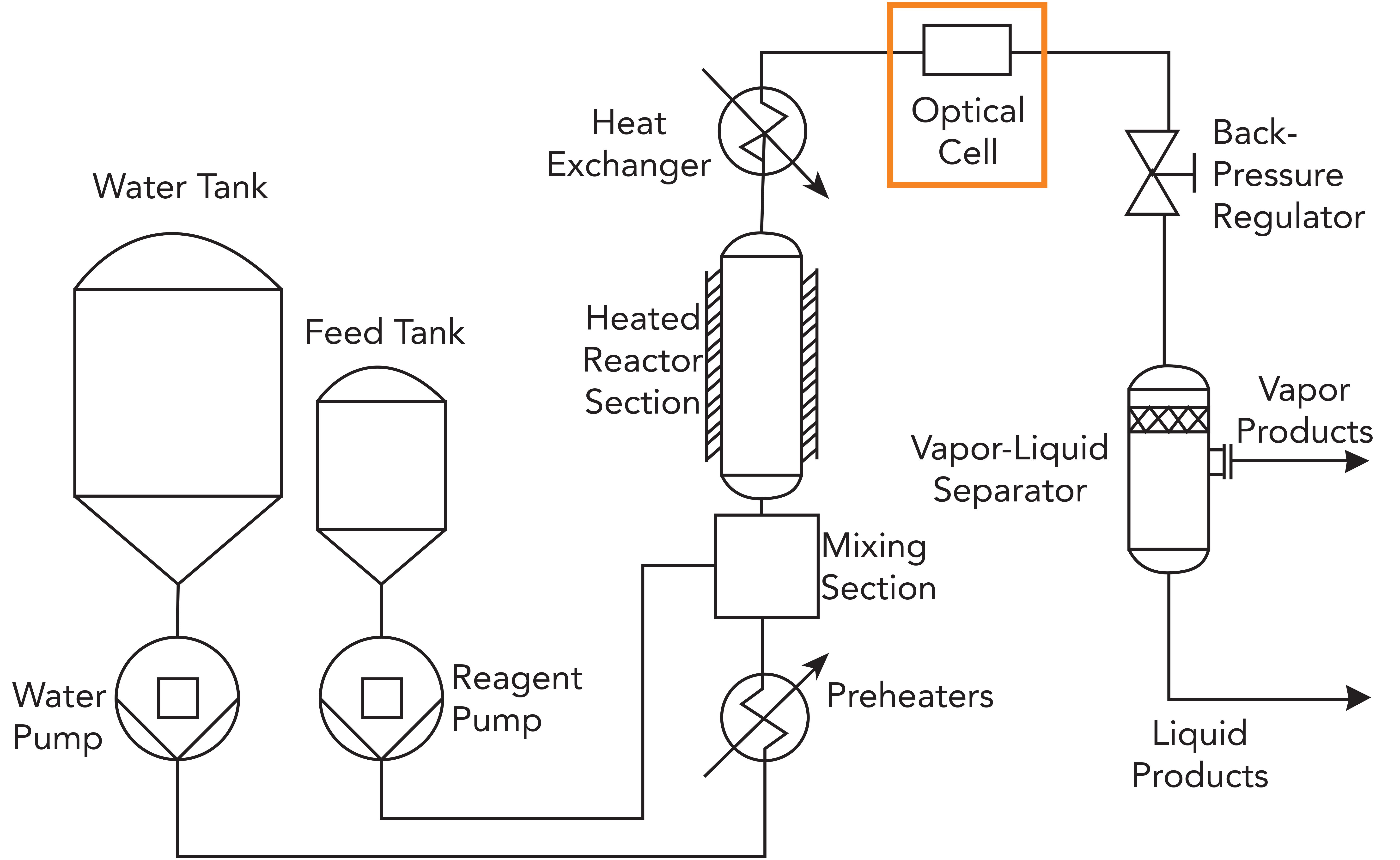 In a study conducted by professor Igor V. Novosselov at the University of Washington, the decomposition of formic acid was monitored in a continuous sub- and supercritical water reactor at temperatures between 300 and 430 ºC, at a pressure of 25 MPa, with a residence time between 4–65 s, and a feedstock concentration of 3.5 wt%. Raman instrumentation and a MarqMetrix immersion BallProbe were located immediately after the heat exchanger (optical cell in Figure 4) to allow for in situ monitoring of the product species in the quenched effluent stream.