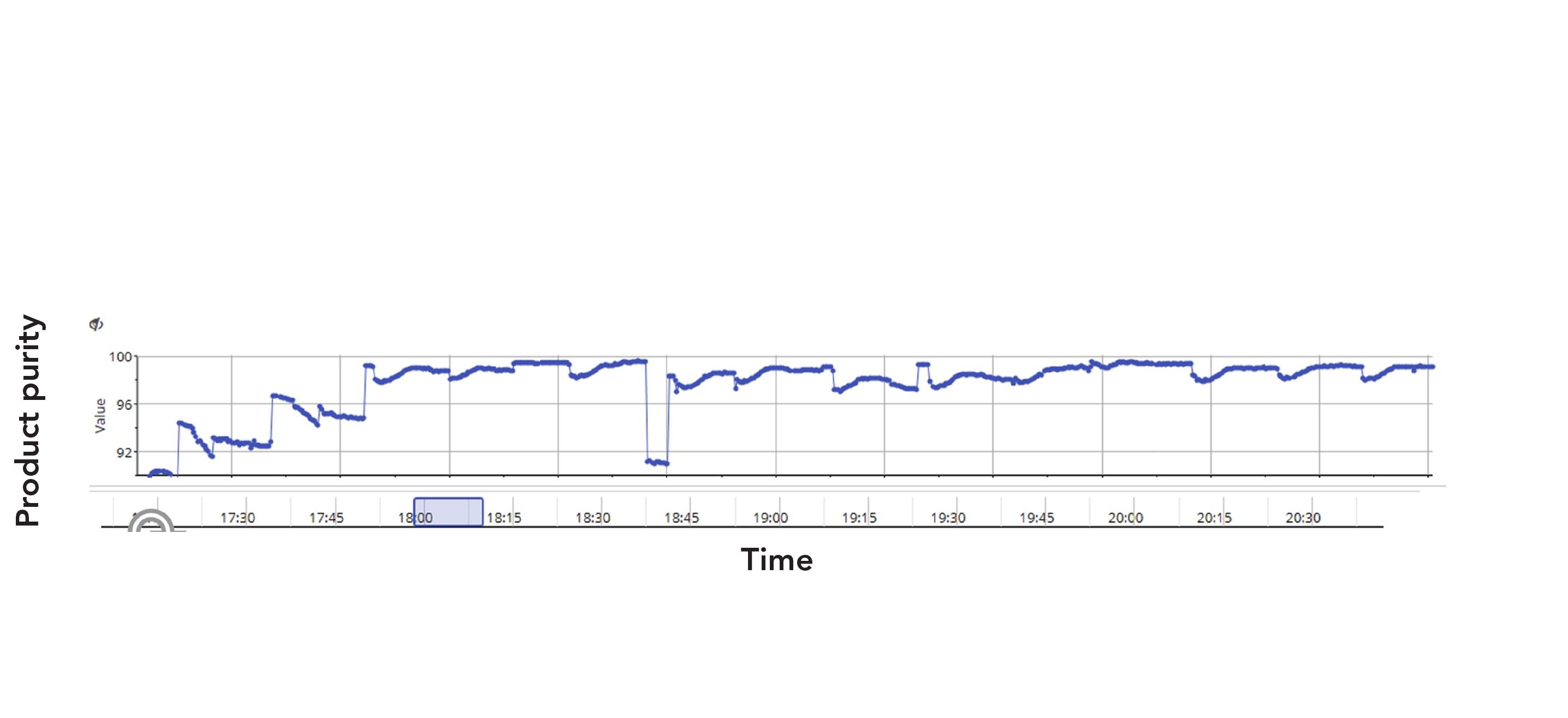 Figure 3 shows the continuous Raman spectroscopy analysis of product purity versus time. Process operators set control limits, alarms, and warnings on the process control system. Results were updated once per minute, enabling the operators to optimize process settings to ensure all material produced is within specification resulting in increased product yield and reduced cycle times.