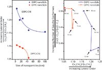 Figure 6: (left) Lateral order of DPPC and DSPC alkyl chains measured by Raman scattering intensity ratio, I[Ï a(CH2)]/I[Ï s(CH2)] = I2884/I2845, as a function of nanoparticle size. (Right) Ratio of gauche/trans conformers in DPPC and DSPC alkyl chains measured by Raman scattering intensity ratio, I[Ï (C-C)G]/I[Ï (C-C)T] = I1090/I1060, as a function lateral order of the alkyl chains for SLBs of different nanoparticle sizes.