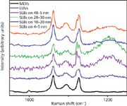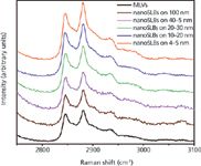 In this work, we present an effect that has not been previously observed spectroscopically, using the conformationally dependent bands in the optical skeletal region and bands in the methylene stretching region that are sensitive to lateral packing order. In particular, zwitterionic 1,2-dipalmitoyl-sn-glycero-3-phosphocholine (DPPC) and 1,2-distearoyl-sn-glycero-3-phosphocholine (DSPC) SLBs were shown to form increasingly interdigitated structures as the nanoparticle size decreased. A vibration at 1122 cm-1 attributed to alkyl chains with a single gauche rotation of the terminal methyl group near the bilayer center — a conformation that permitted better hydrophobic packing of the chains on curved surfaces — was recorded in the Raman spectra of these SLBs.