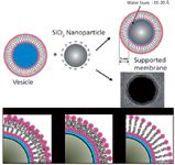 Figure 1: Schematics of formation of a supported lipid bilayer on SiO2 nanoparticles, and interdigitated, partially interdigitated, and bilayer structures. Cryo-TEM image of a supported lipid bilayer on a 100-nm nanoparticle.