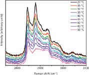 Raman spectroscopy analysis was performed using a micro-Raman spectrometer (RM 1000, Renishaw, Gloucestershire, United Kingdom) with a 514.5-nm air-cooled Ar ion laser source and an 1800-lines/mm grating polychromator with RenCam CCD detection, providing a resolution of 1 cm-1. The laser source was focused on the sample nanoparticle suspension through a long working distance, 50× objective, to a spot diameter of approximately 2 μm, and the Raman signal from the SLBs was collected in backscattering geometry. The samples were studied in standard aluminum pans for DSC (TA Instruments, New Castle, Delaware). A THMS600 heating stage (Linkam Scientific Instruments, Surrey, United Kingdom) was used for temperature control with 0.1 °C accuracy of the nanoparticle suspensions during phase transition studies. In those cases, Raman spectra were recorded after allowing thermal equilibrium to be achieved at every temperature point for 10 min.
