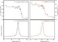 Figure 5: (Top) Lateral order parameter as a function of temperature for SLBs on 40â50 and 4â5 nm SiO2. (Bottom) Corresponding nano-DSC thermograms showing calorimetric phase transition temperatures.