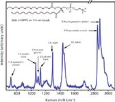 Figure 2: Raman spectrum of supported lipid bilayers of DPPC, showing structure of DPPC and band assignments. The intensity in the 650â1800 cm-1 region is shown magnified approximately 5Ã of the original for clarity.