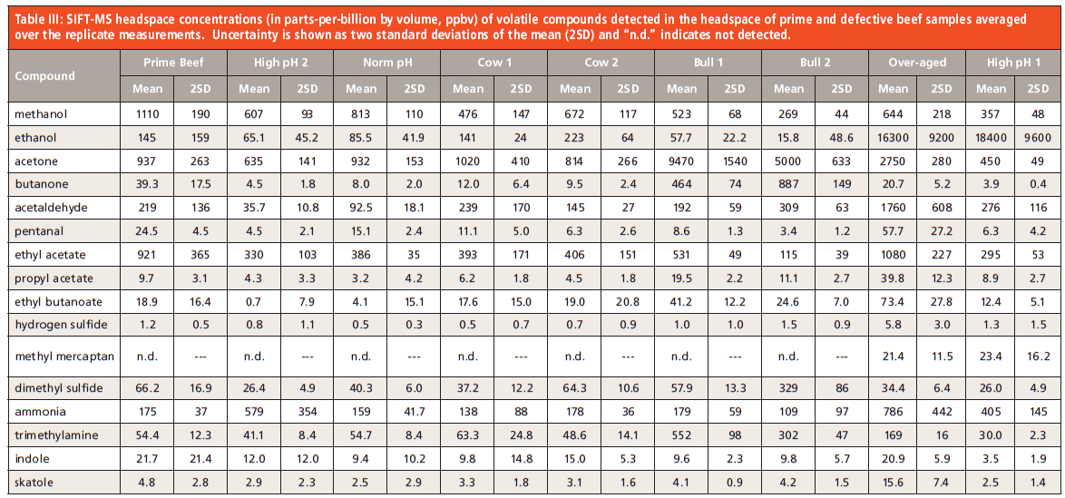 The results presented here demonstrate that the SIFT-MS technique can effectively discriminate between prime and defective beef flavors when coupled with multivariate statistical analysis. The laboratory-based approach used here enables throughputs of about 30 samples/hour to be achieved. Even in its present form, SIFT–MS shows promise for wider scale flavor quality testing off-line compared to the traditional sensory approach.