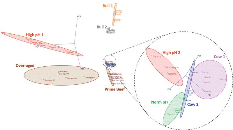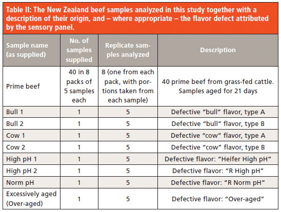 Previous studies have shown that beef from older bull and cow animals can be associated with "barnyard" and "milk" notes, respectively. Beef with an elevated final pH (high pH) relates to carcasses that have insufficient glycogen at the point of slaughter to enable the normal post mortem glycolytic cycle to progress. This condition has been associated with "sour" or metallic-like notes. Therefore, samples with these attributes were included in the sample selection provided by Carne Technologies (Table 2).