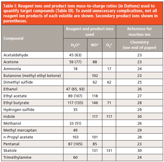 In this paper, a Voice200 SIFT–MS instrument (Syft Technologies, Christchurch, New Zealand; www.syft.com) was utilized in selected ion mode (SIM). The compounds targeted together with the masses used for quantitation are summarized in Table 1. The three standard positively charged reagent ions were utilized to achieve selective analysis.