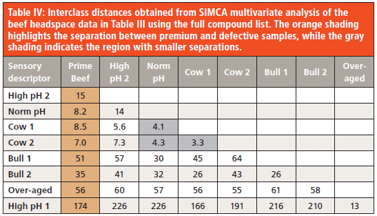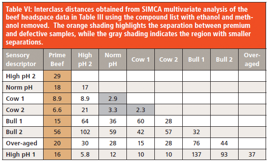 Table 5 summarizes the relative significance of various target compounds in discrimination of the beef samples: the larger the number, the greater the contribution. Ethanol dominates discrimination. Given that the flavor impact of ethanol is lower than the other target compounds, and that ethanol was the key discriminating volatile between grass versus pellet fed cattle (from a parallel, unpublished study), the data was reprocessed using the SIMCA algorithm with both ethanol and methanol removed (methanol was the second most significant discriminator in the feed study). The right-hand column of Table 5 lists the discriminating powers with this revised compound list, while Table 6 gives the interclass distances. The prime beef samples remain well separated from the defective samples, as do most of the defects from each other. However, the two "cow" samples ("Cow 1" and "Cow 2") are no longer completely separable with an interclass distance of 2.3, and "Cow 1" is not entirely distinguishable from the sample labelled "Norm pH".