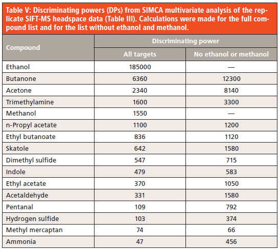 The Selected Ion Mode (SIM) data from SIFT–MS were treated using multivariate statistical analysis to determine the ability of SIFT–MS to discriminate between the premium samples labelled "prime beef" and samples deemed defective by the sensory panel.