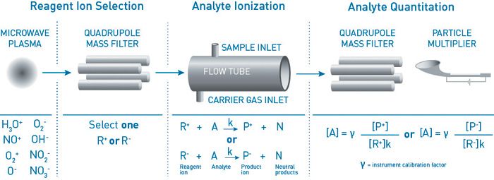 SIFT–MS uses soft, precisely controlled chemical ionization, coupled with mass spectrometric detection (Figure 1), to rapidly quantify VOCs to low part-per-trillion concentrations by volume (pptv). Eight chemical ionization agents (reagent ions) are now available in commercial SIFT–MS instruments: H3O+, NO+, O2+, O-, O2-, OH-, NO2-, and NO3- (19). These reagent ions react with VOCs and inorganic gases in well controlled ion-molecule reactions, but they do not react with the major components of air (N2, O2, and Ar). This enables SIFT–MS to analyze air at trace and ultra-trace levels without pre-concentration.