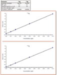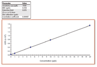 In this study, two serum samples (Seronorm) were analyzed. The samples were diluted 1:20 with 1% (v/v) HNO3 and Rh internal standard (0.5 ppb) was added. A Burgener Ari Mist nebulizer and standard injector torch were used in conjunction with high-sensitivity interface cones fitted to the ICP-MS. Calibration solutions were prepared from blank to 0.1 ppb Ag. Spiked sera were prepared at 0.1, 0.2, 0.5, and 1.0 ppb before 1:20 sample dilution, to evaluate the spike recovery performance at different Ag levels. The total analysis time was 4 min (including uptake, wash, three repeats/sample and a survey scan from m/z 102 to 111). The Ag calibration and figures of merit are shown in Figure 3 (parameters are shown in the table above Figure 3). The analysis results are given in Table V.