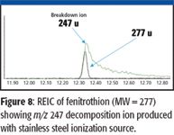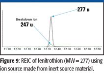 Various stainless alloys have been the material of choice for ion-source manufacturing for many years. Although stainless steel alloys have many favorable properties for ion sources, such as resistance to oxidation and corrosion and being nonmagnetic, they also can react with many organic compounds at high temperatures and produce deleterious effects. This could be demonstrated by comparing an electron-capture detector chromatogram with an RTIC produced by an electron ionization source. The RTIC often would produce a very asymmetrical peak with excessive tailing, and the mass spectrum of the compound would contain peaks that were indicative of thermal reaction between the sample and stainless steel. Figure 8 illustrates the abundant 247 ion that originates from a reaction between the compound and the source. Use of new ion-source materials that are constructed from inorganic conductive materials containing nitrides and disulfides of metals has reduced the decomposition of reactive compounds significantly in the ion source. Figure 9 shows the virtual elimination of the m/z 247 ion that was indicative of source interactions. An additional benefit of the new ion-source material is an increase in sensitivity for reactive compounds. Compounds containing phosphorus and sulfur moieties have shown 50–100% increases in response using the inert source material.