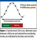 Generally, a GC–MS analysis was designed to be either qualitative (full scan) or quantitative (SIM only). GC–MS electronics did not have the bandwidth required to quickly change the rf and dc voltages needed to acquire both qualitative (scan) and quantitative (SIM) data synchronously during the same GC–MS analysis. However, GC–MS electronics have been improved significantly in the last few years. Current instruments can scan a spectrum at 10,000 amu/s (versus 650 amu/s in the 1970s) and switch between ions during an SIM analysis in 1 ms. These new capabilities allow synchronous collection of scan and SIM data (Figure 1) during an analysis without compromising the quality of data in either mode. No longer does a GC–MS method have to be developed to collect either qualitative or quantitative data, as both types of data can now be acquired during one analysis.