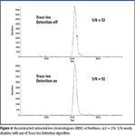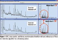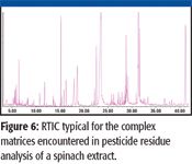 Advances in microprocessor technology and software algorithms have now made the real-time analysis of complex matrices possible. One example is the Trace Ion Detection algorithm (Agilent Technologies, Palo Alto, California), which improves the analytical quality of the data by removing spectral noise and chemical artifacts in the mass spectral data. One of the primary benefits of this approach is improved analysis of compounds in complex matrices. The performance of the algorithm is illustrated in Figures 4 and 5.